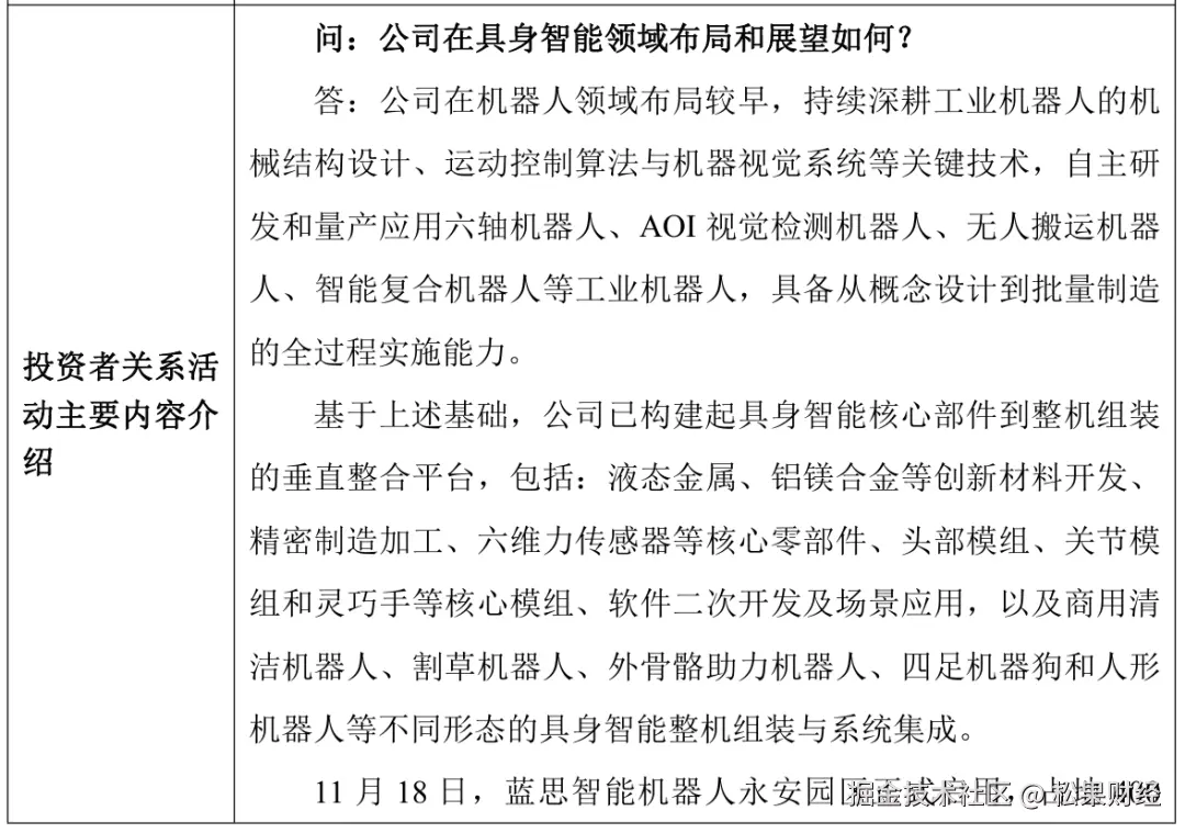 而在方兴未艾的具身智能时代,蓝思更是提前布局,其关节模组、灵巧手已批量交付,整机组装规模位居行业前列,目标是全球最大的具身智能机器人制造平台。