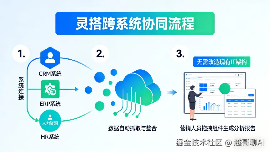 它的核心优势是“低代码定制”和“跨系统协同”。很多企业的痛点是不同部门用不同的软件——销售用CRM,财务用ERP,人力用HR系统,数据无法互通。“灵搭”能通过非侵入式方式连接这些系统,无需改造现有IT架构,就能实现数据的自动抓取和整合。