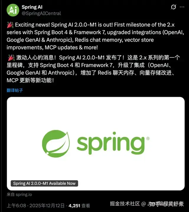 在此之前,Spring AI 1.1 正式版于上月发布,带来了 MCP 开箱即用、Prompt 缓存、自进化智能体等特性。