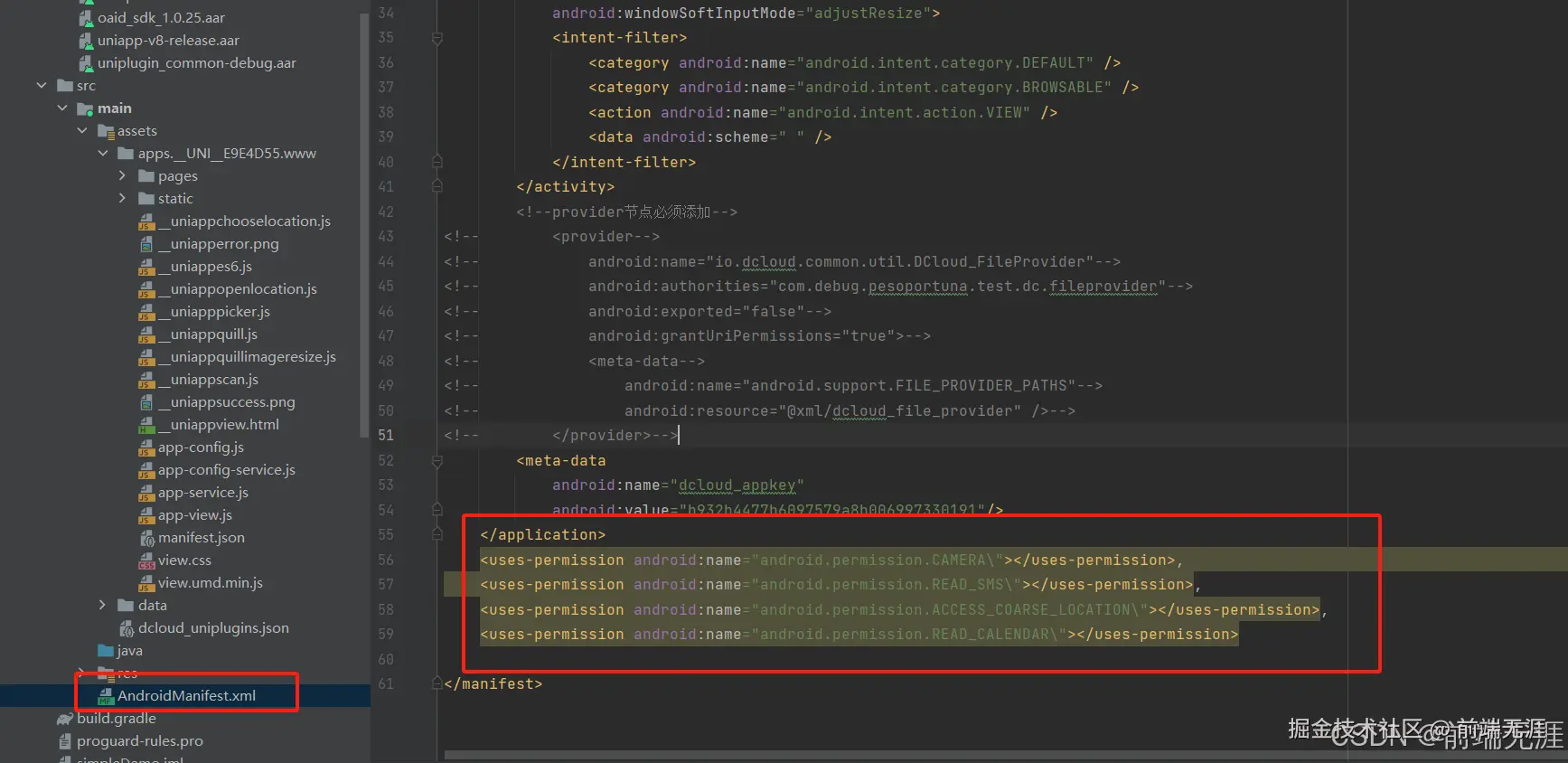 uniapp跨平台开发---本地运行权限正常,离线打包提示权限未获取 前端无涯 2025-12-16 30 阅读1分钟 问题描述:uniapp在HbuilderX本地真机运行,获取所有权限都正常弹框获取,但是Android Studio 离线打包环境真机模拟其他权限正常获取,相机权限未提示获取 问题原因: 经过排查涉及硬件权限,离线打包需要在AndroidManifest.xml文件去增加权限声明