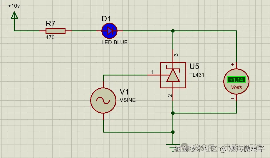 当参考极的电压小于2.5v,431是截止的,发光二极管不会亮