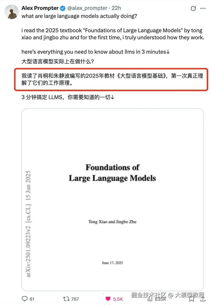 这本中国人写的大模型书已经在外网被很多人引用为 2025 年最好的大模型教材,reddit、X 上很多人在推荐,有人说第一次知道大模型到底在干嘛。