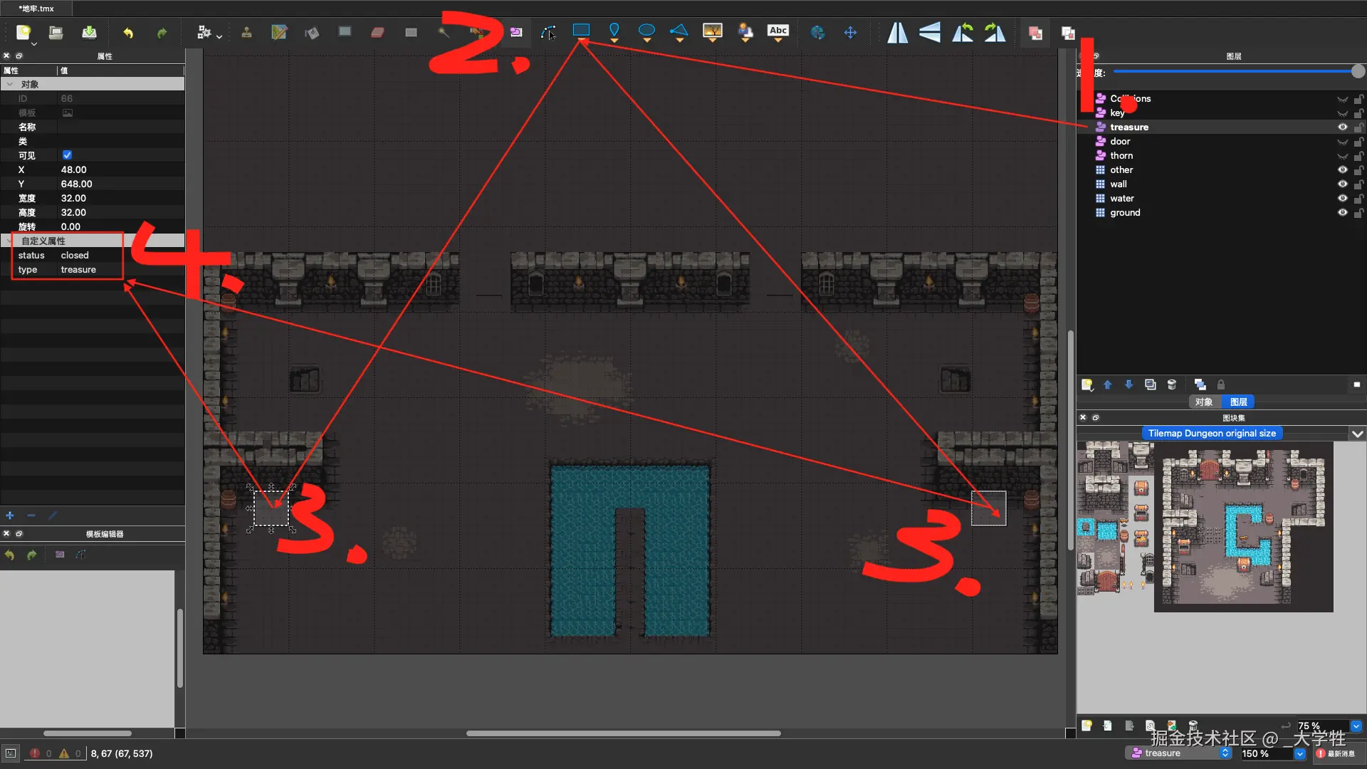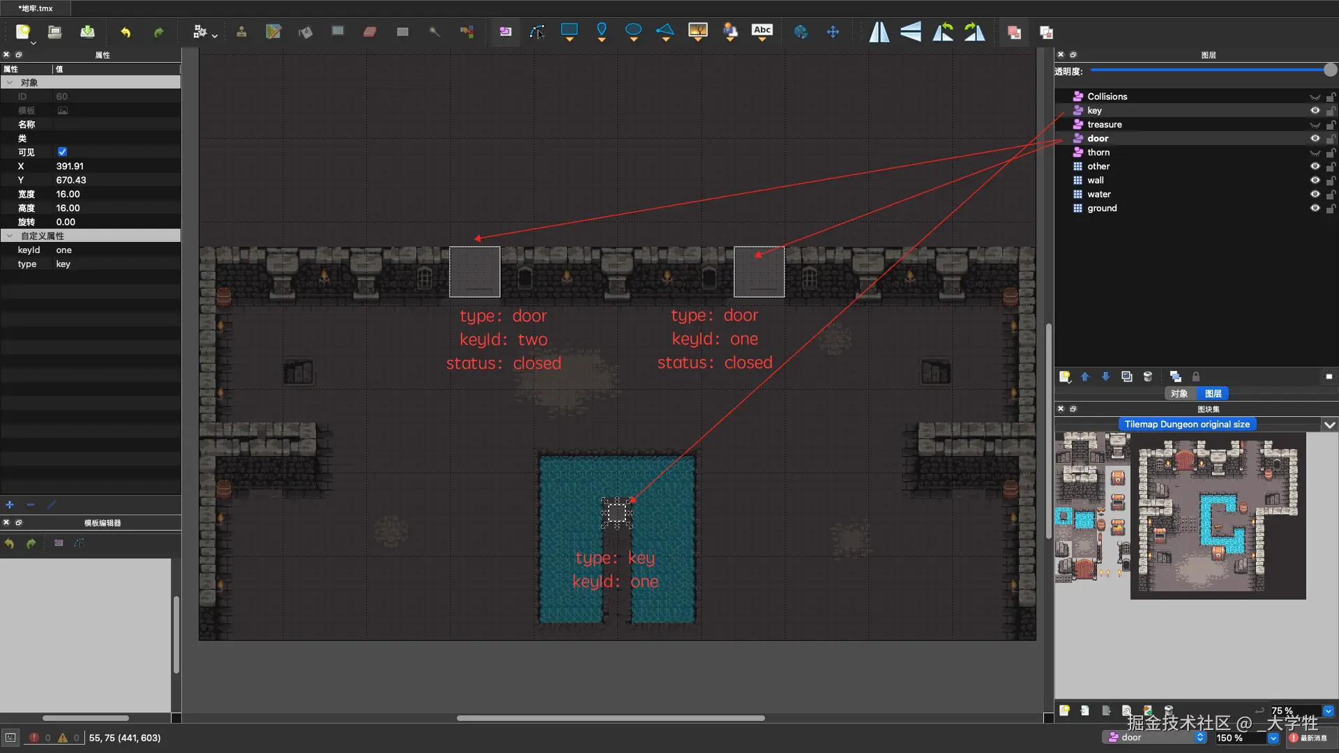 通过上述步骤,我们完成了宝箱、钥匙、门 和 地刺 这几类常见元素的交互 。
