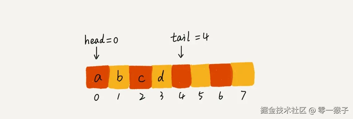 比如上图,tail 移动到了 7,当再入队一个元素,如果 0 是空闲的,那 tail 就可以移动到 0。初始状态,head=tail,此时队列为空。当 tail 移动到 head 的前一个位置时,队列就满了。