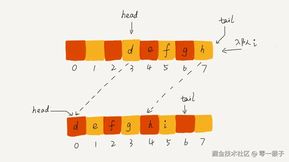上图把 d-h 五个元素搬移到数组的头部,并入队新元素 j。