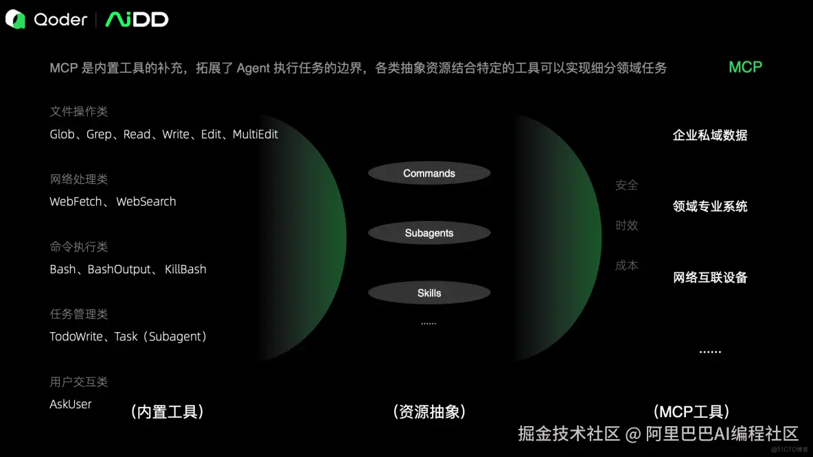 Qoder CLI 内置了文件读写、网络请求、Bash 执行等基础工具,还支持通过 MCP 协议接入外部服务(比如私有 API、数据库工具等),突破安全或成本限制。