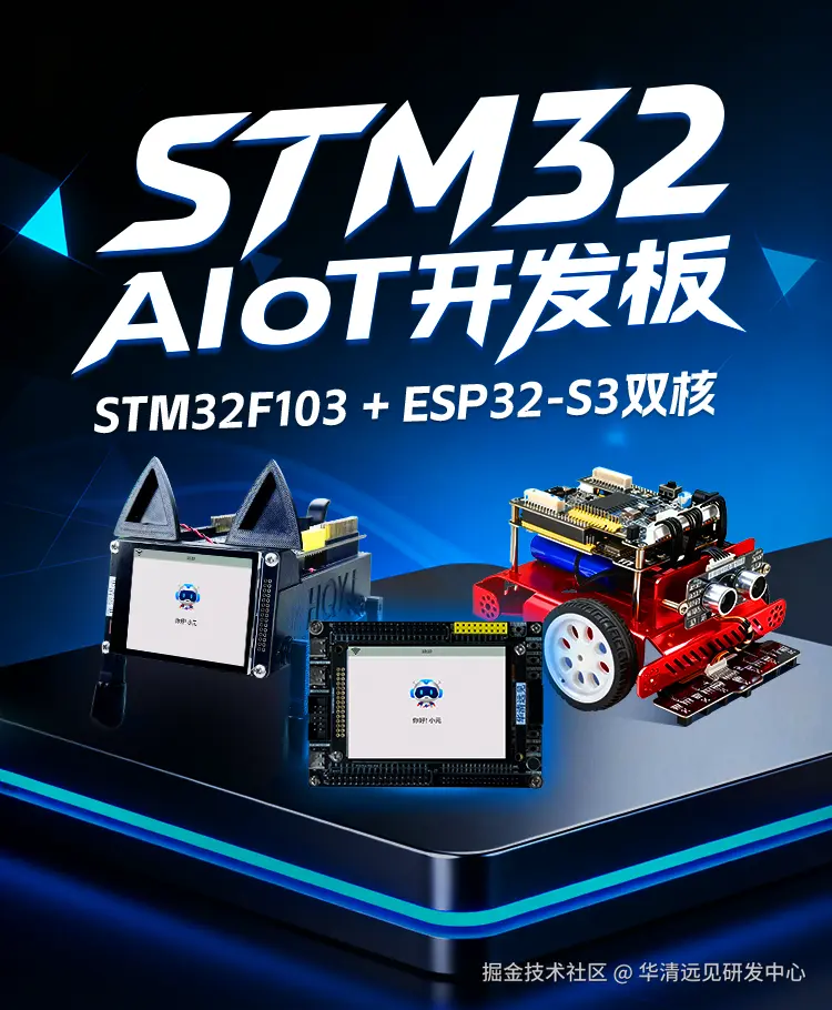 F103&ESP32-S3 AI 开发板是华清远见针对嵌入式与 AI 开发市场需求,打造的高性能、低成本AIoT实战平台。该开发板采用双核心设计,整合了STM32F103与ESP32-S3两款芯片:以ESP32-S3作为AI中枢,承担视觉识别、语音交互及 WiFi/BLE 无线通信任务;以STM32F103作为控制核心,实现实时运动控制与多传感器数据融合,二者通过 UART 总线无缝协同,形成 “AI 决策 + 实时执行” 的高效工作模式。