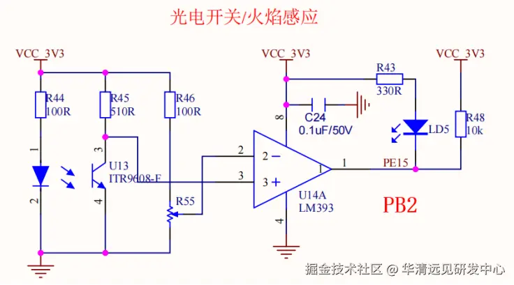 根据以上特性,调整好电位器后,只要有遮挡那么U13的3号脚就是高电平,反向端小于正向端,U14比较器1号脚输出高电平,LED灯熄灭。