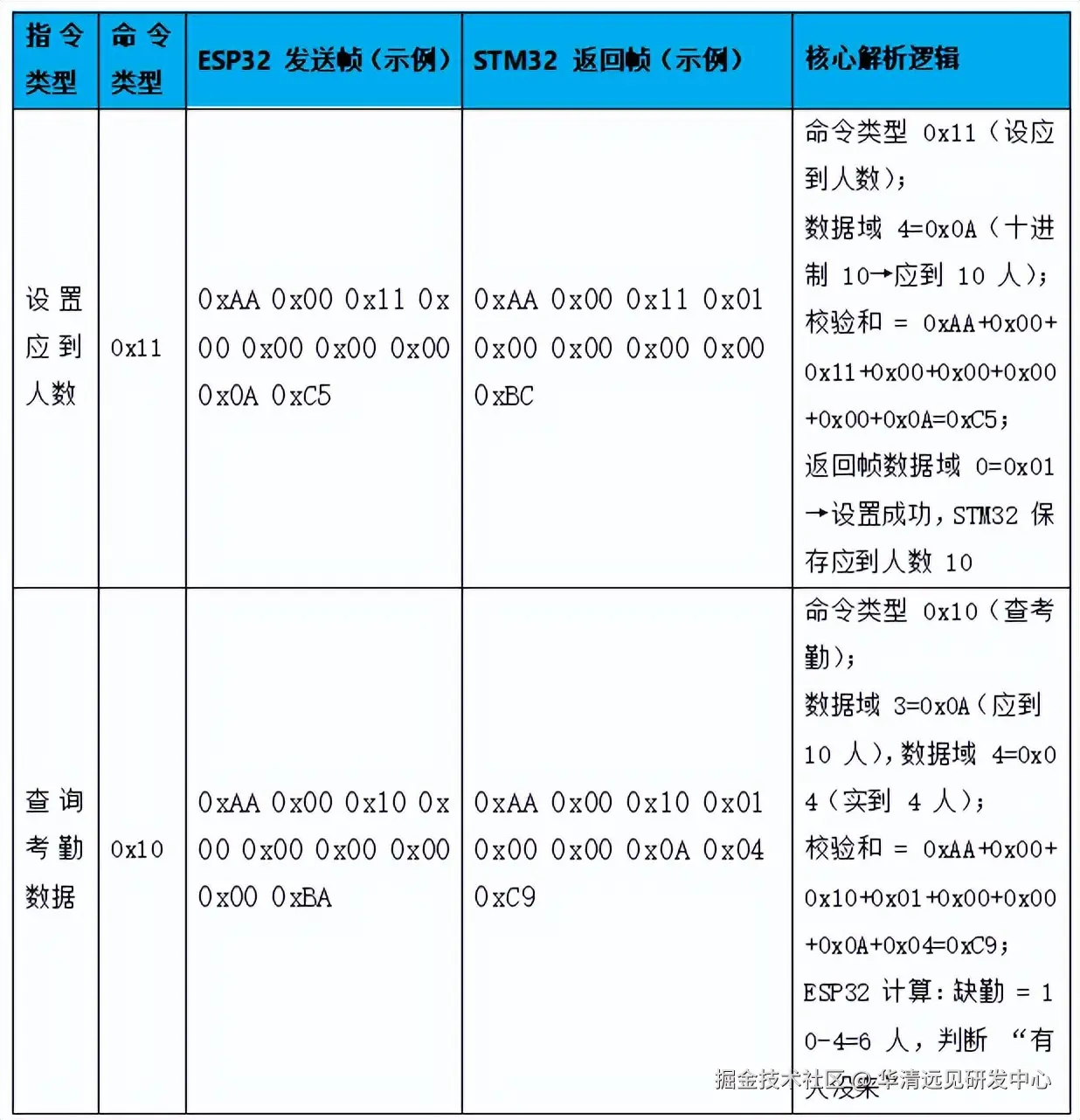 4.双芯通信协议 :9字节固定帧格式,支持两类指令(0x11设置应到人数,0x10查询考勤数据)