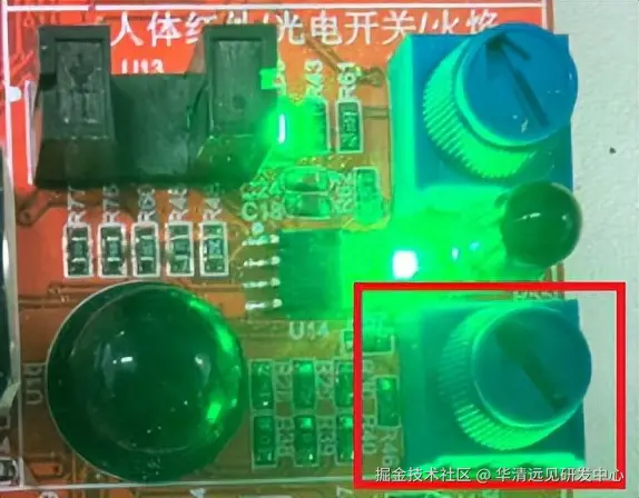 根据上图可以看到,U13对应的光电开关的接收器,当没有遮挡的时候,U13上方的3号脚就是低电平,连接U14A比较器,那么比较器的3号脚就是低电平。这个时候要设置电位器R55,对应实物如下图所示,设置到相关一个阻值,可以根据光电开关旁边的LED灯来判断,要调整到LED点亮的阻值就可以了,这样就知道U14的比较器此时2号脚的电压是高电平,大概在1.5V左右,而在没有遮挡的情况下,3号脚为低电平,那么此时比较器的反向端大于同向端,U14比较器的1号脚输出低电平,LED灯点亮。