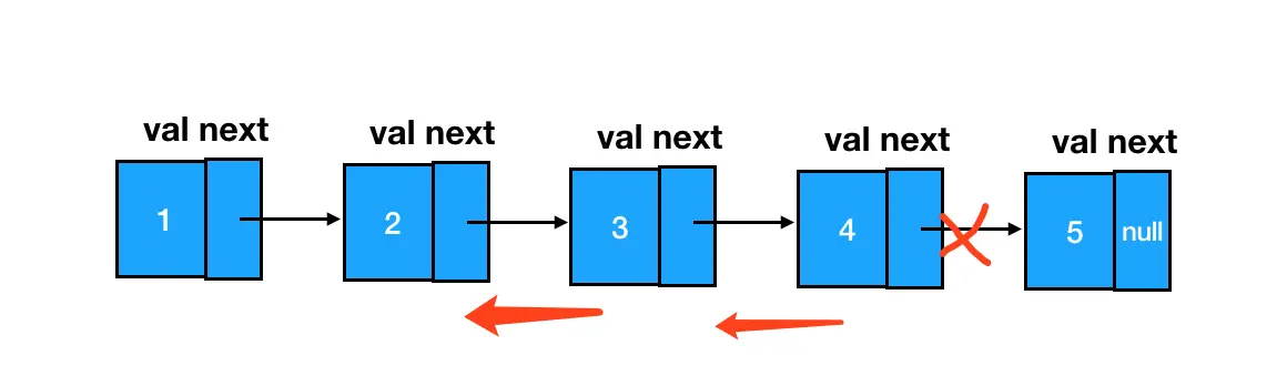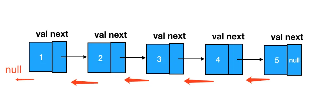咱们从第一个结点开始,每个结点都给它进行一次 next 指针的反转。到最后一个结点时,整个链表就已经被我们彻底反转掉了。