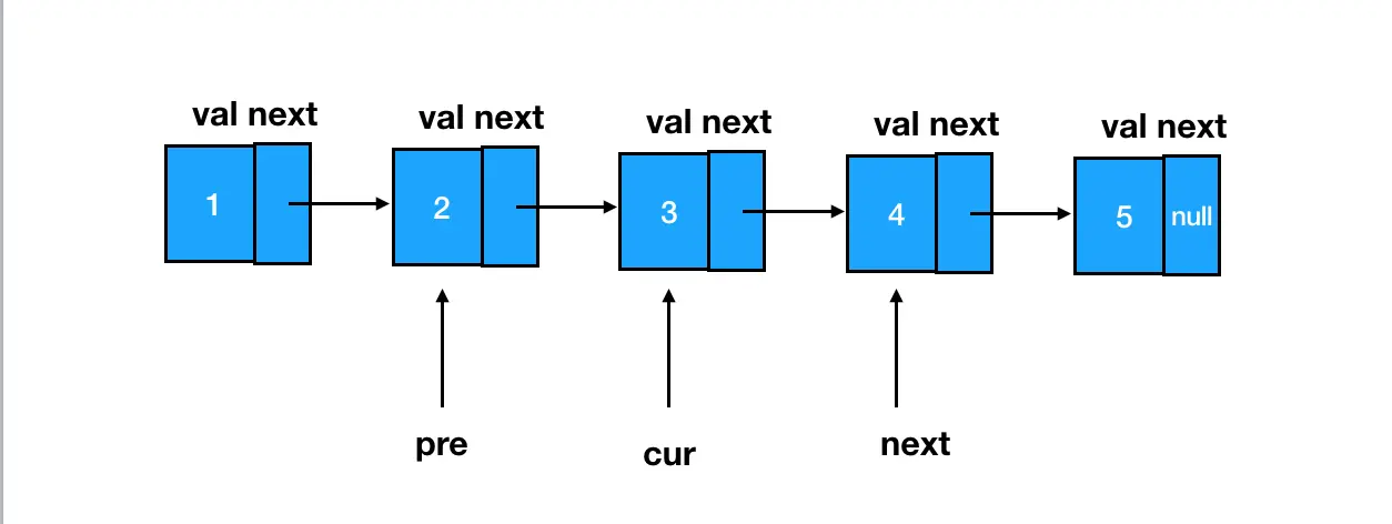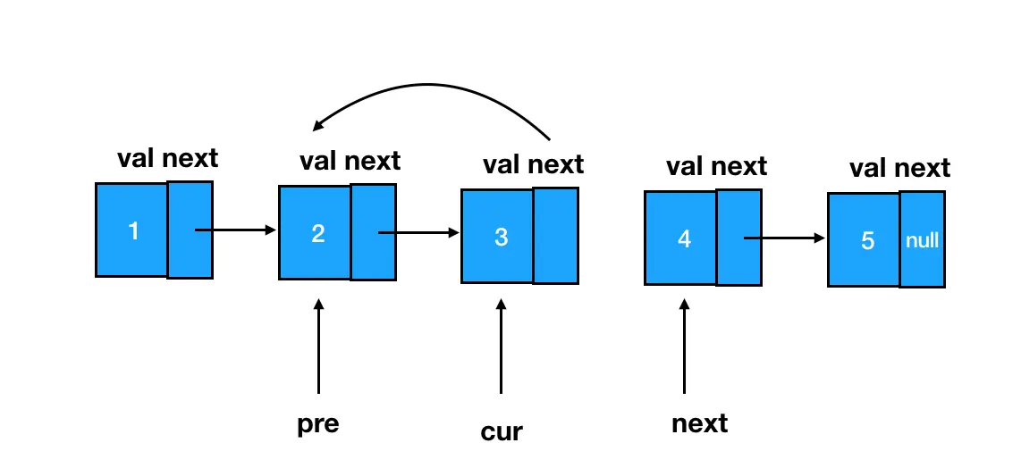 这里我只需要一个简单的cur.next = pre,就做到了 next 指针的反转: