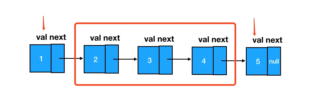按照题中的示例,假如我们需要反转的是链表的第 2-4 之间的结点,那么对应的指针逆序后会是这个样子: