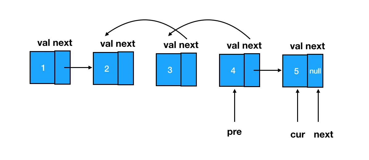 由于我们遍历链表的顺序是从前往后遍历,那么为了避免结点1和结点2随着遍历向后推进被遗失,我们需要提前把1结点缓存下来。而结点5就没有这么麻烦了:随着遍历的进行,当我们完成了结点4的指针反转后,此时 cur 指针就恰好指在结点5上: