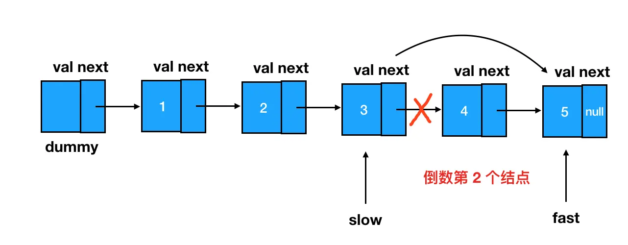 若用快慢指针,我们其实是把做减法和找定位这个过程给融合了。通过快指针先行一步、接着快慢指针一起前进这个操作,巧妙地把两个指针之间的差值保持在了“n”上(用空间换时间,本质上其实就是对关键信息进行提前记忆,这里咱们相当于用两个指针对差值实现了记忆),这样当快指针走到链表末尾(第 len 个)时,慢指针刚好就在 len - n 这个地方稳稳落地。