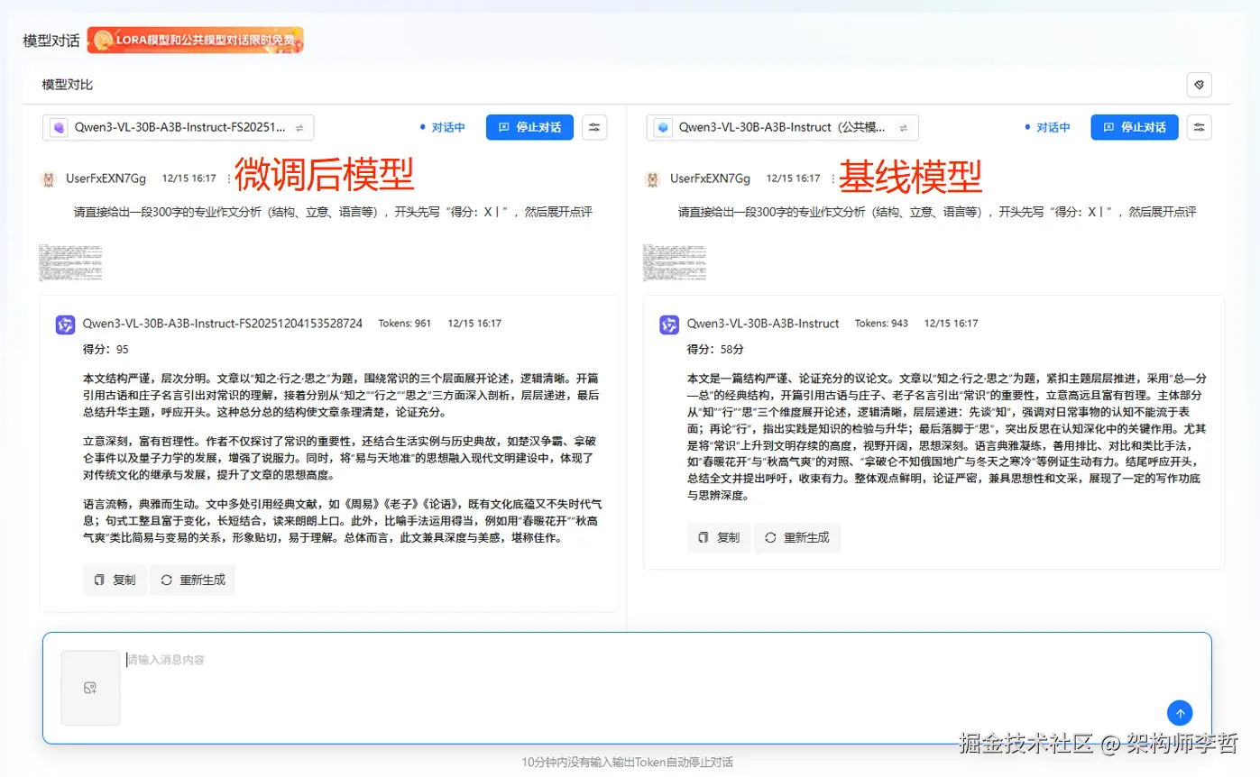 传统自动化作文评分系统多基于规则和浅层特征,而大模型带来了根本性变革——它不再只是“检查”,而是真正“理解”。我们选用的Qwen3-VL-30B-A3B-Instruct模型,通过300篇精选高中作文数据的指令在LLaMA-Factory Online上进行微调,深度对齐了中文作文的评分标准。模型不仅能评估语言表达的规范性,更能理解文章的逻辑结构、思想深度和情感价值——这些正是优秀作文的灵魂所在。