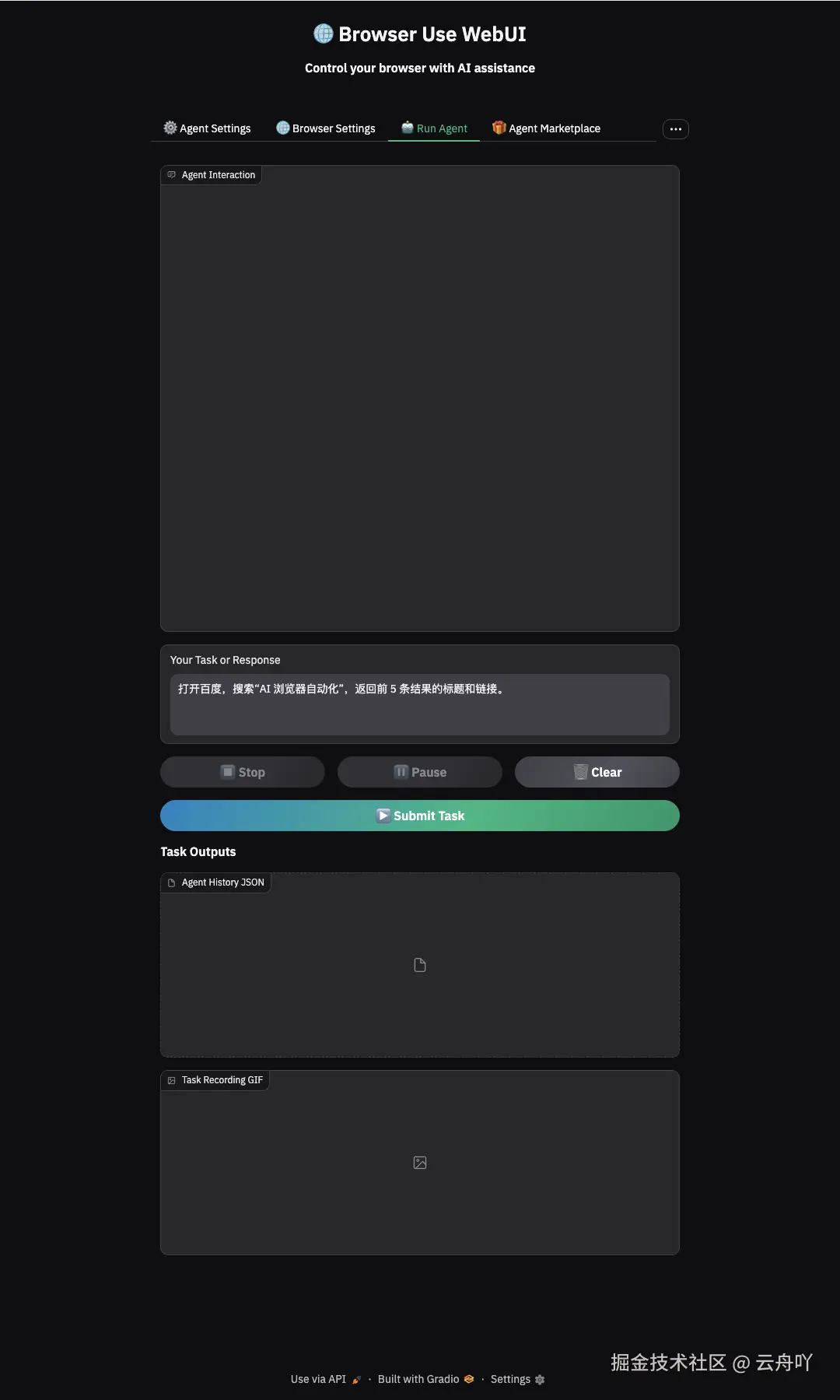 点击“Submit Task”按钮,WebUI 会自动启动浏览器并执行任务。执行过程中,可实时查看:
