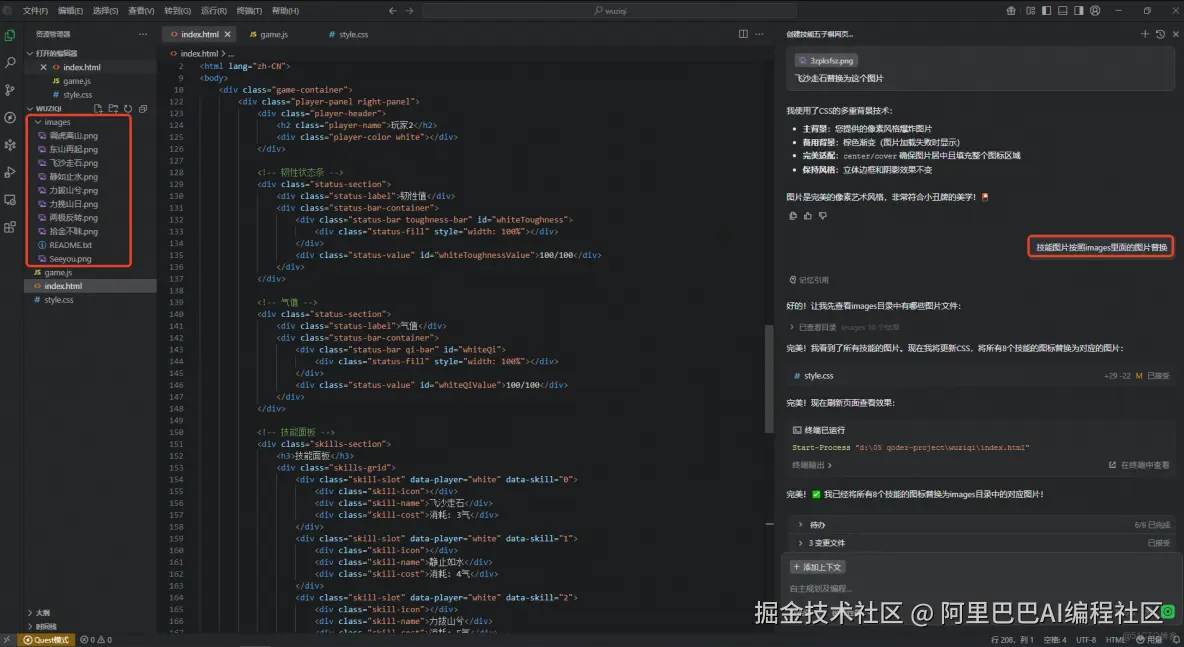 2.将需要添加的技能准确描述发送给 Qoder,并指定 Qoder 将技能卡片替换为存放在项目目录下的图片。