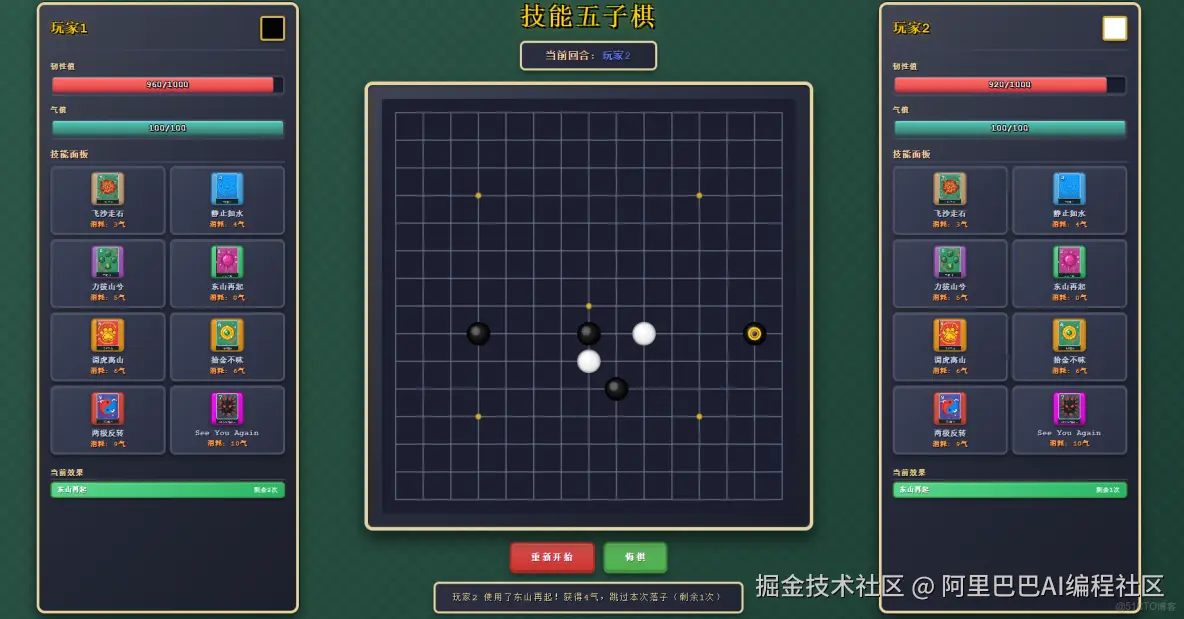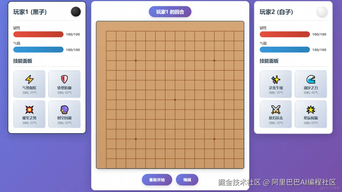 编写一个名为“技能五子棋”的网页游戏,游戏包含一个经典简洁的五子棋界面,游戏包含技能规则和技能数值系统,要体现一个对战双方的UI界面,显示其韧性状态条、气值、技能面板等UI元素,其中黑子方叫“玩家1”,白子方为“玩家2”。