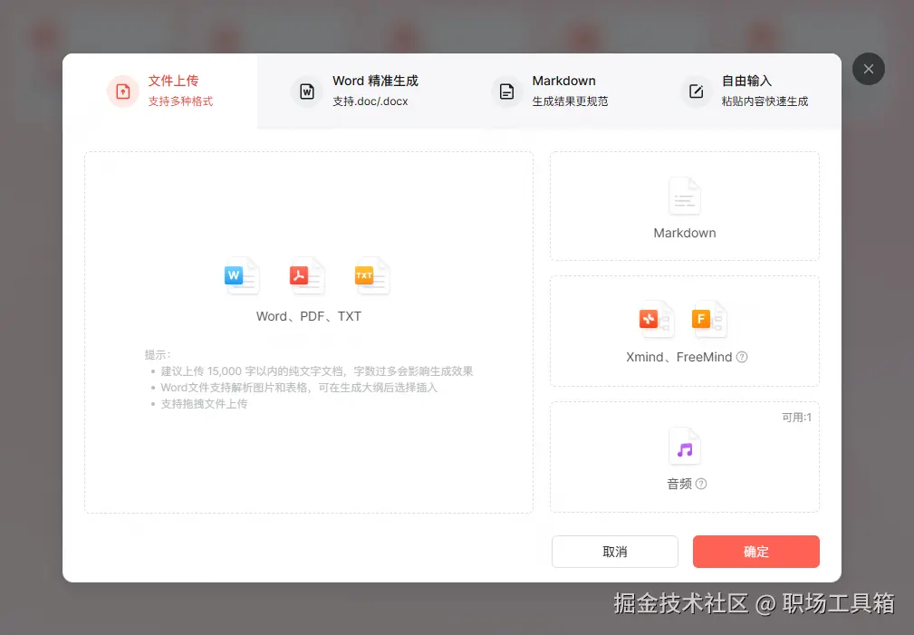 导入大纲:打开博思AIPPT首页,直接粘贴你的Markdown笔记或上传Word文档。AI会自动识别标题层级。