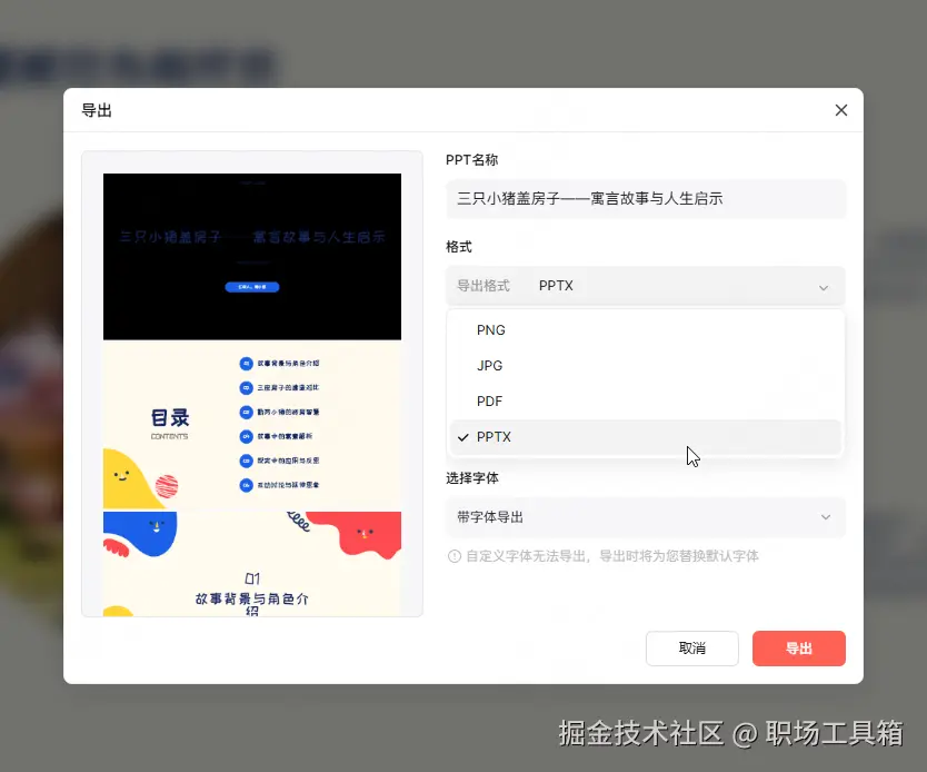 导出高清:最后,选择导出为PPTX格式。博思AIPPT支持无损导出,确保在大屏幕投影时图片依然清晰。