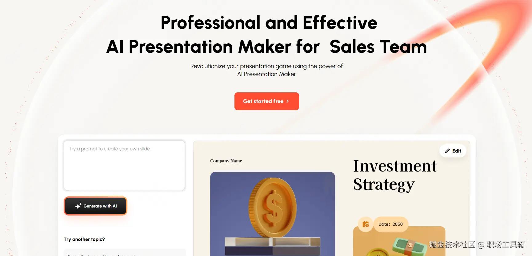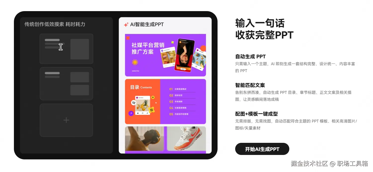 AI自动匹配:点击生成。此时,智能排版引擎开始工作,提取每一页的关键词(如“市场份额”),并从库中匹配一张饼图或金币堆叠的高清图。