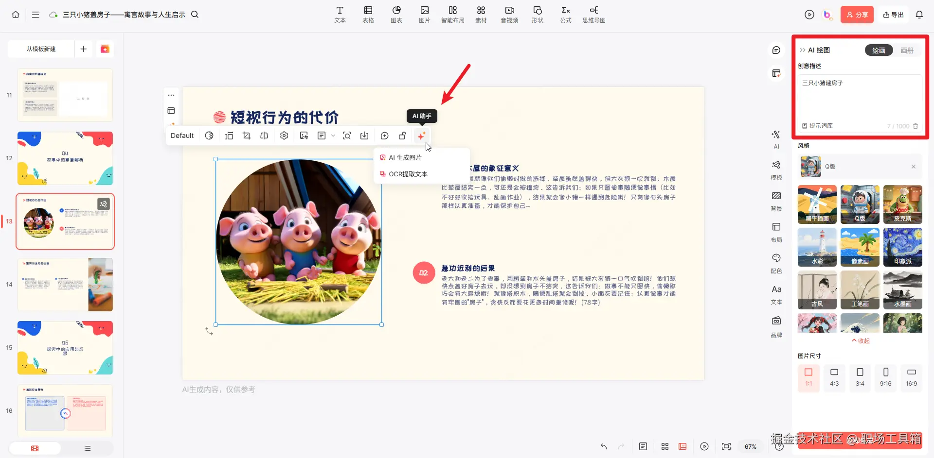 选中PPT页面上的任意一张图片,选择“AI 助手 > AI 生成图片”,打开右侧的AI绘画界面,在创意描述输入提示词,描述配图内容或需求,接着选定图片风格和尺寸,点击底部的“立即生成”,即可一键生成对应的图片。