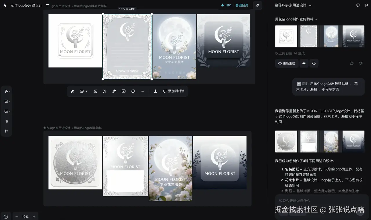 - Canva(国内版) 操作非常简单,像在做 PPT,但更偏“排版工具”,真正生成品牌级 logo 的能力偏弱,对月光花局这种清冷、克制的风格支持不够。
