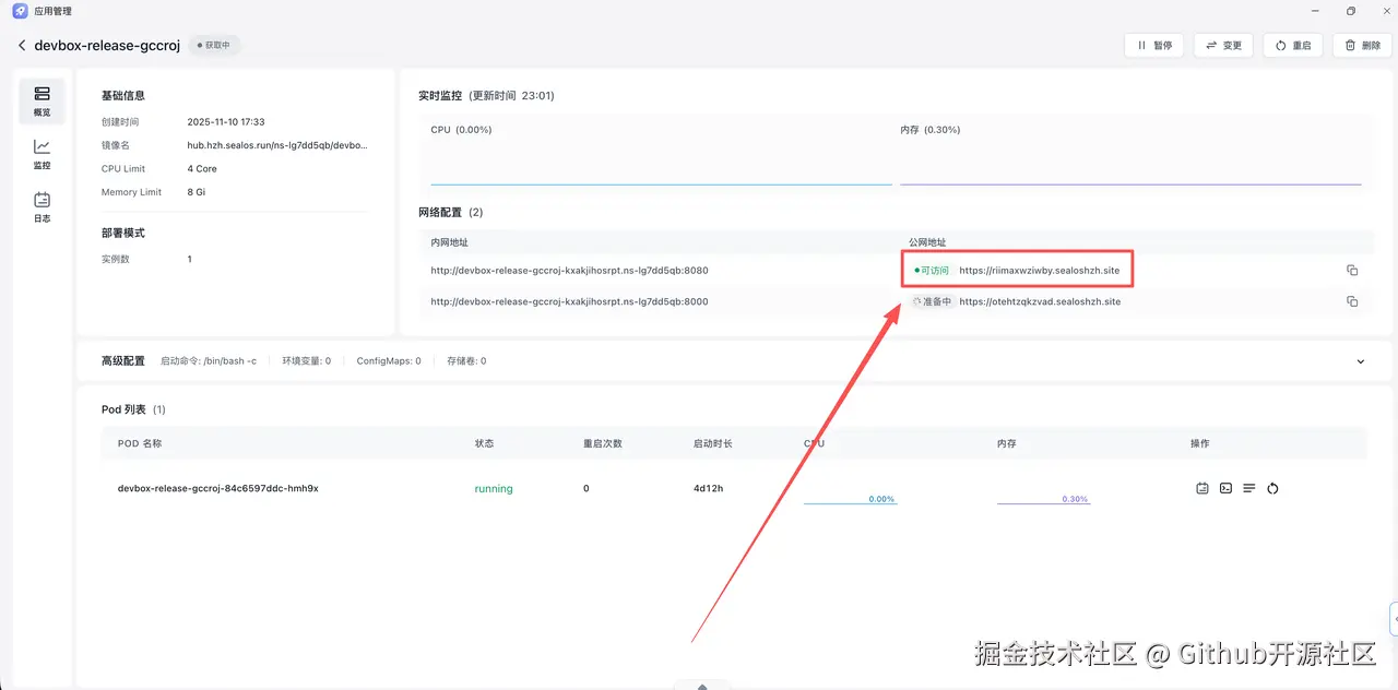 - 自动跳转至应用管理,配置并完成部署。 版本发布成功后,系统自动跳转到应用管理界面,并为我填好了刚刚发布的镜像地址。我只需要开启外网访问、设置好端口,点击“部署应用”,不到3分钟,应用就成功运行并分配了一个公网域名。 从此,我再也不用去手动配置Nginx或折腾HTTPS证书了。