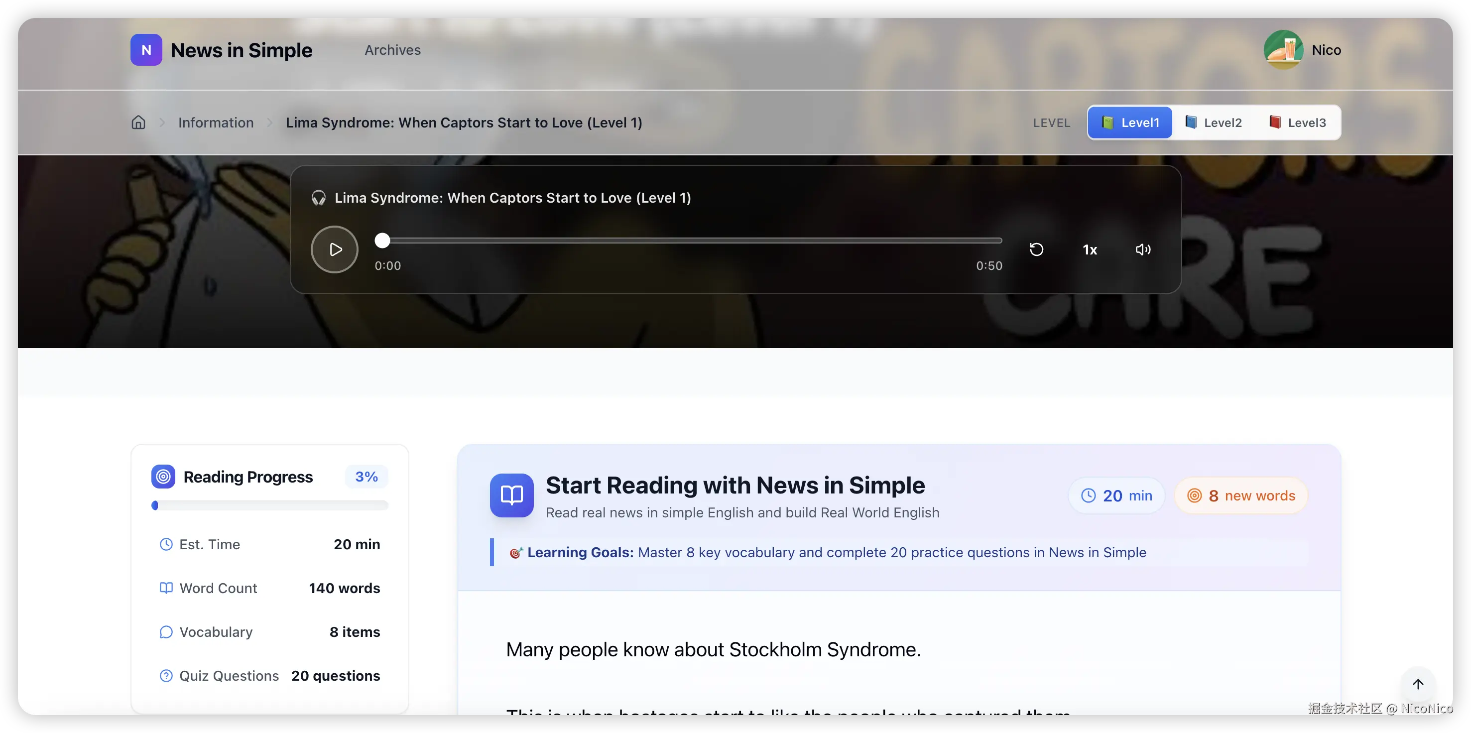 既然 LLM(大模型)具备了极强的 NLP 能力,我决定自己开发一个工具,对真实世界的英语新闻进行 Refactoring(重构) 。这就是 News In Simple 的诞生逻辑。