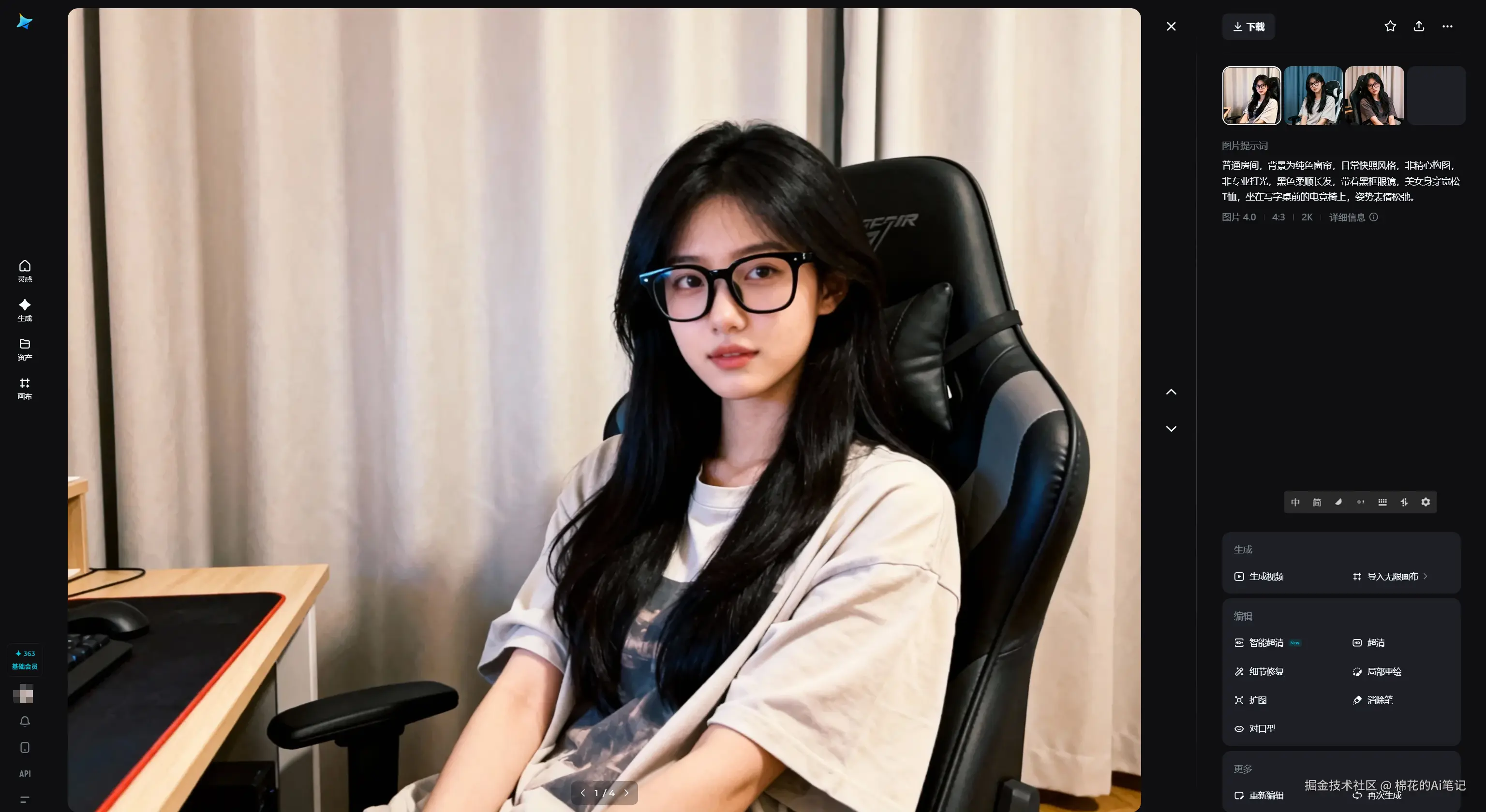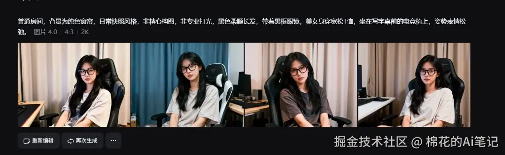 我试着给即梦AI投喂了一段超级日常的描述:“普通房间、黑色柔顺长发、戴着黑框眼镜、宽松T恤、坐在电竞椅上、姿势表情松弛”。