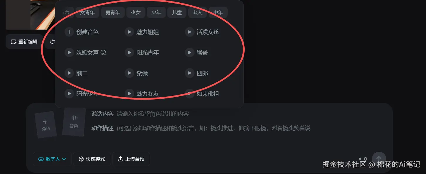 而且在声音选择上,它不光有“活泼女孩”这种现成的甜美音色,最绝的是支持**“上传音频”**!
