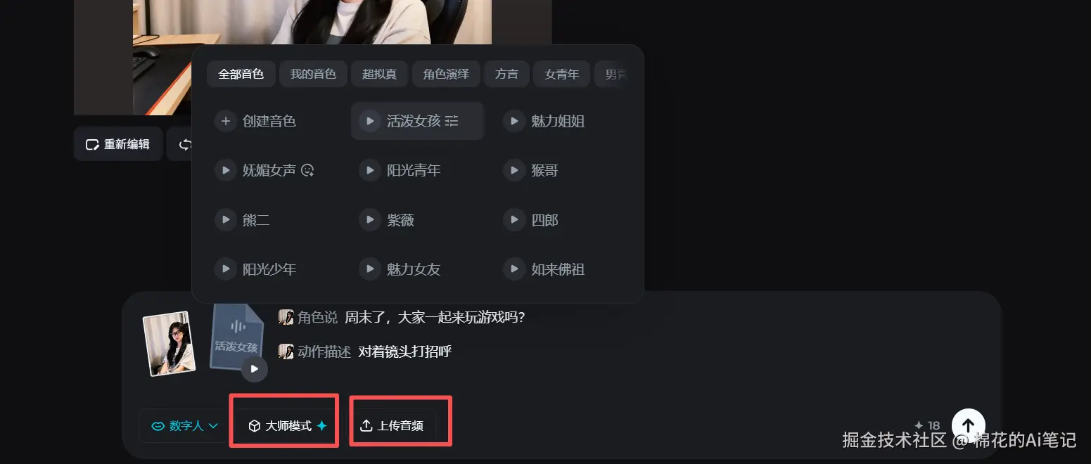 这意味着什么?你可以直接录一段自己的声音传上去,用你的声音配上AI生成的完美状态,这才是真正的“数字替身”啊!