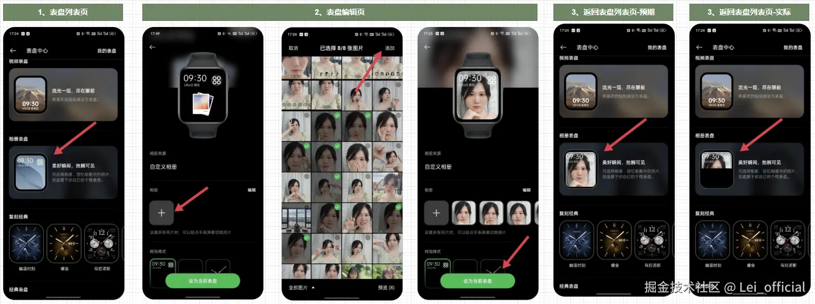 暂且称之为“手表主题模块”,用来管理智能手表主题的样式,用户可以自定义智能手表上的字体、颜色、布局、背景图等,当用户完成设置后,生成当前配置下的预览图,并保存在应用数据目录下(Android/data/packageName/files/aaa_111.png),其它页面(例如表盘列表页)监听到预览图变化的事件后,更新 UI,展示出最新的预览图。