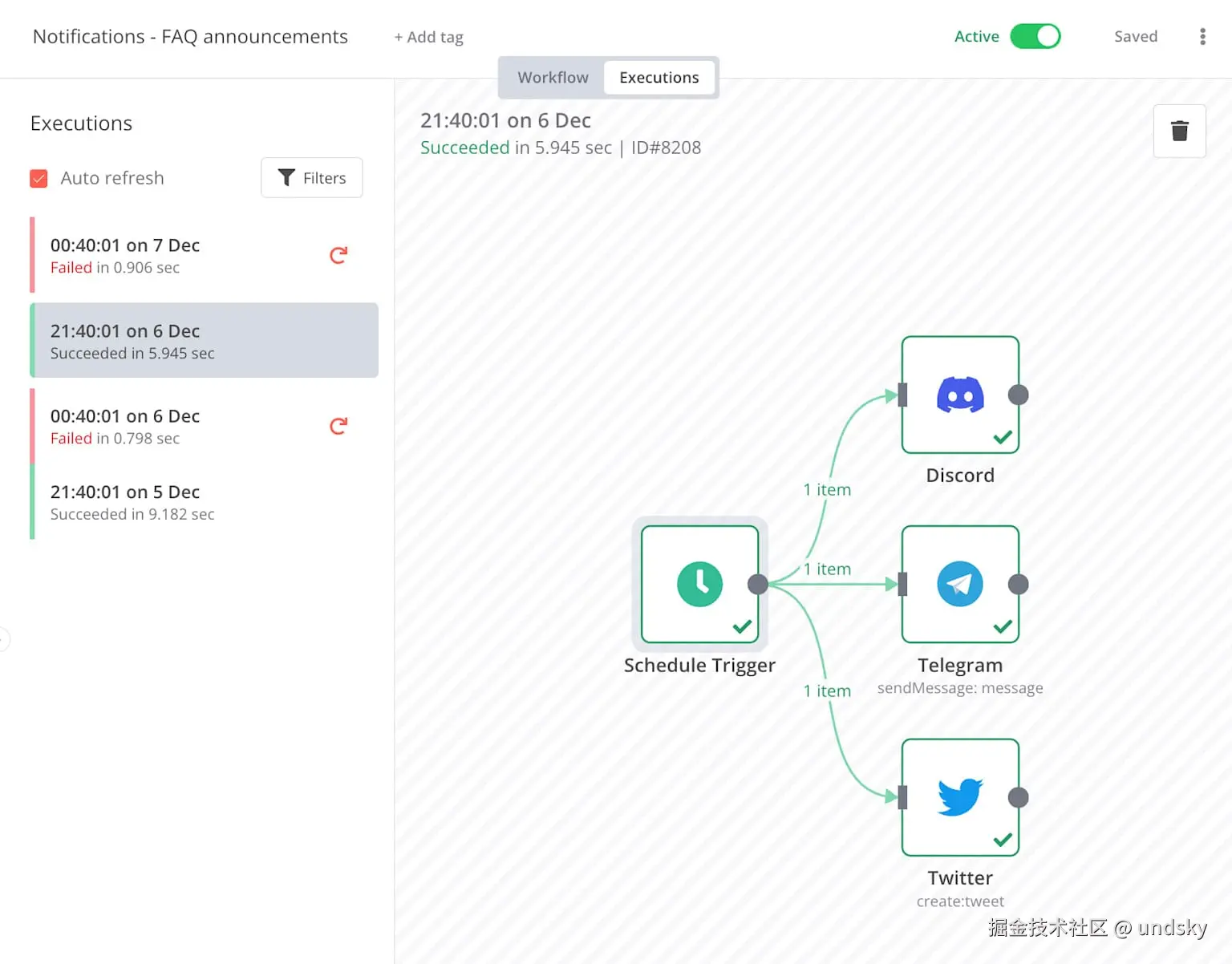 - 当触发条件满足时(时间到了、Webhook 被调用、收到新事件等),工作流会自动运行。4. 需要暂停时,再切回 Inactive,就不会再自动触发。