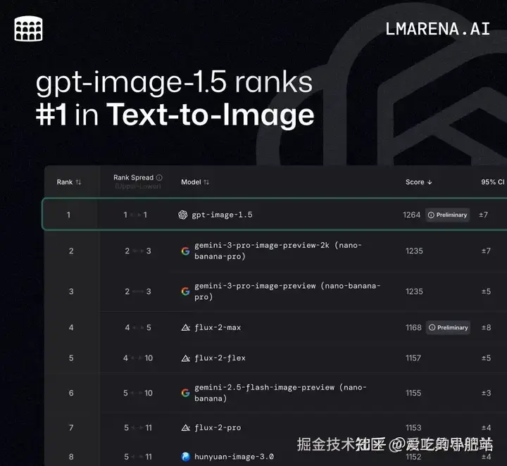 在看GPT Image 1.5的排名,已经在LMArena 的文本到图像中排名第一,而图片编辑是排名第四。