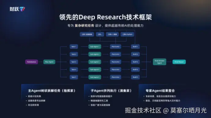 在投研辅助上,由智能体自动完成数据搜集和整理、公司财报额解读、在线估值和撰写报告,通过金融智能体的方式,分析师便能专注在更高价值的工作。