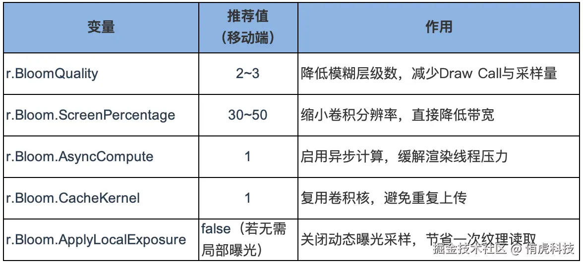 A:Bloom(泛光)的性能开销主要来自GPU带宽、计算量与多级采样次数,其关键影响因素和可调参数如下: