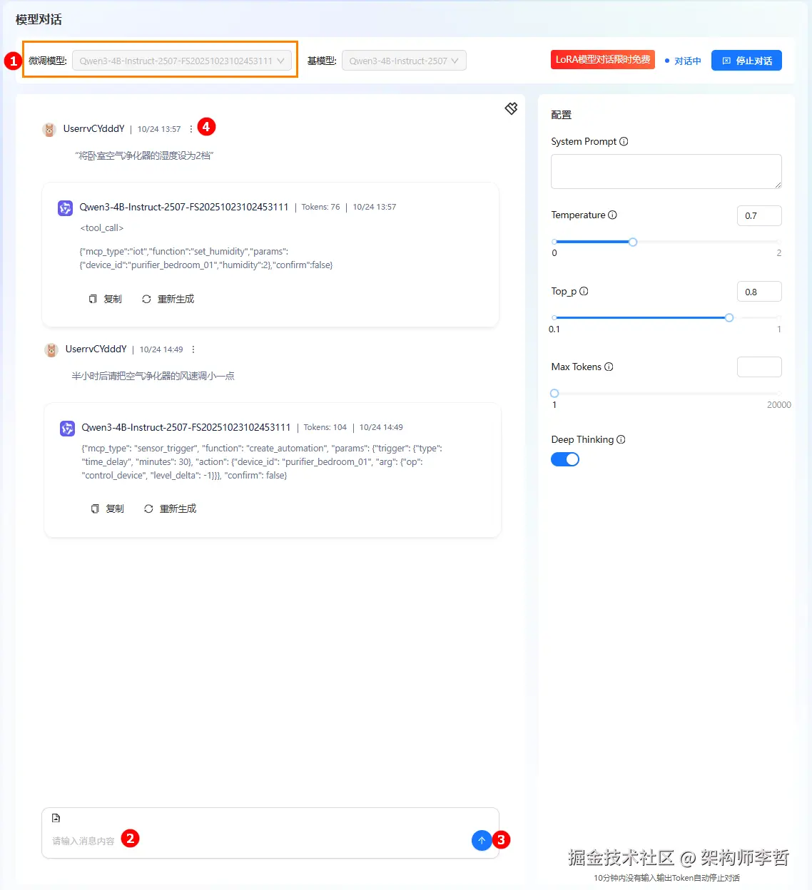 在“模型对话”界面选择微调后的模型,即可实时体验复杂指令解析: