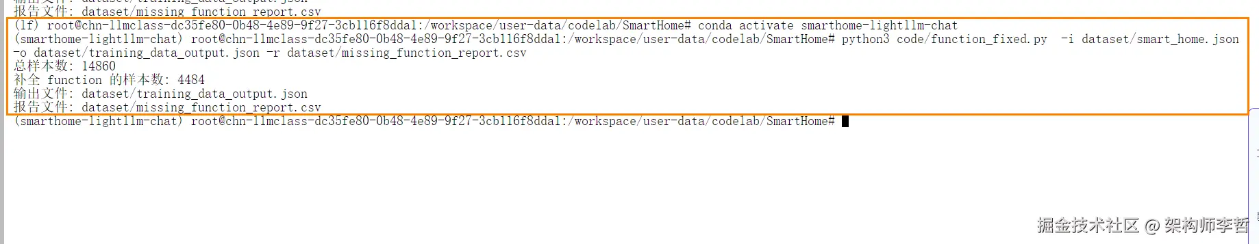 进入“SmartHome”文件夹,新建终端,激活 Python 环境 smarthome-lightllm-caht ,在命令行输入以下指令运行脚本,完成数据集的“funcion”字段补全。