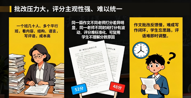 核心痛点集中在教师批改压力巨大、评分主观性强难以统一以及反馈滞后难以形成写作闭环。