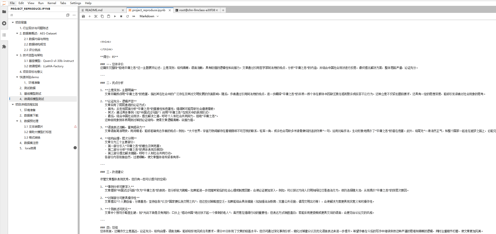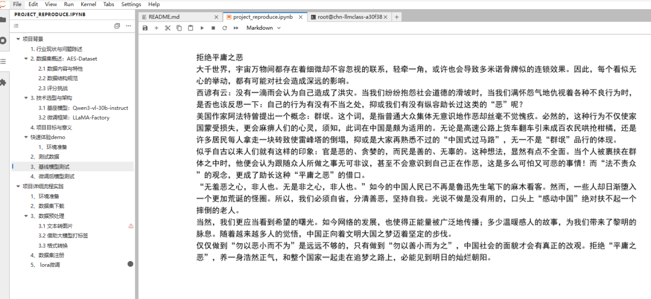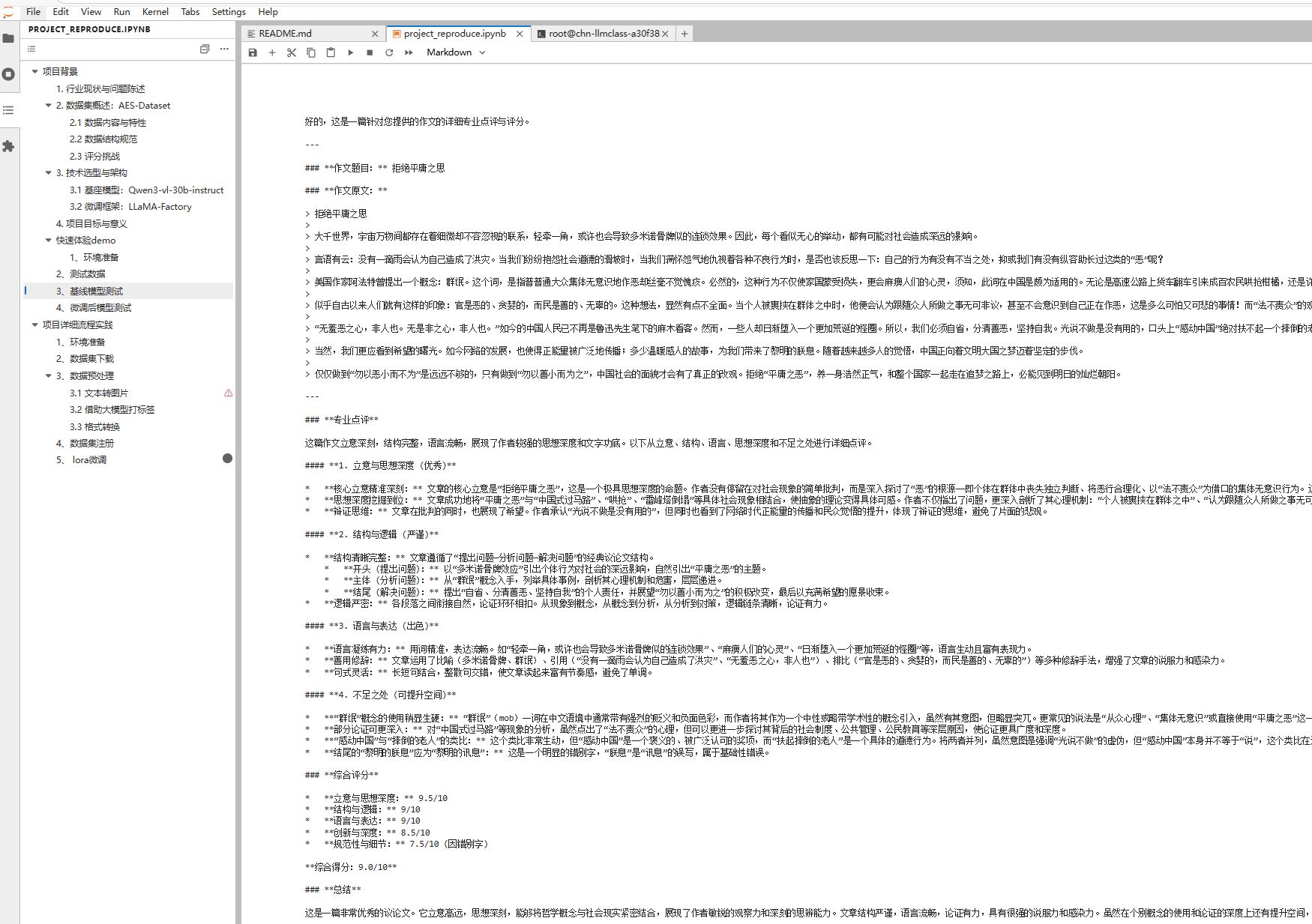 如果你也想亲手体验一次 “大模型 × 作文批改” 实战,可以在 project_reproduce.ipynb 中的「项目详细流程实践」模块按以下步骤来。