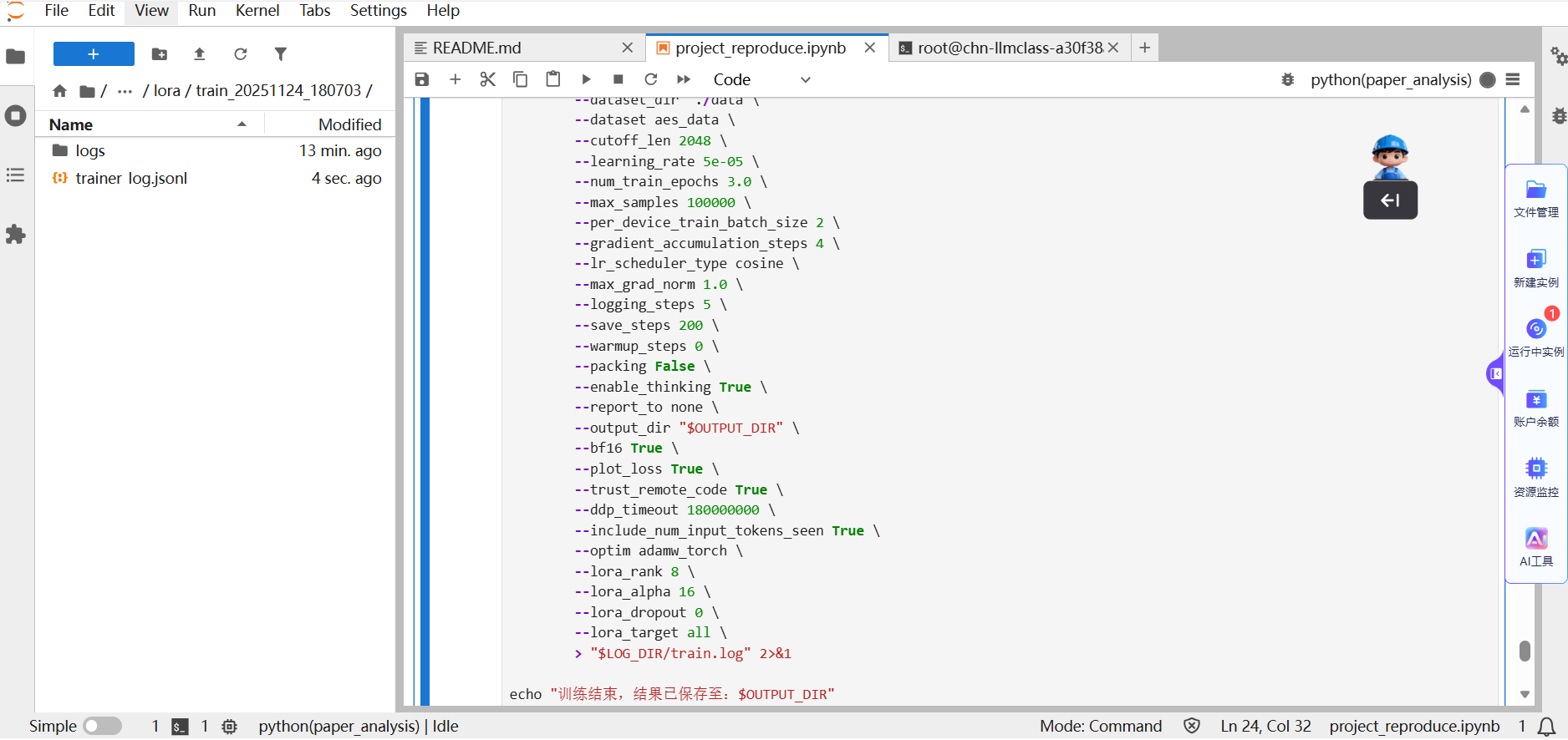 你可以在Notebook 中:指定 LoRA 权重保存路径;通过配置文件调整;学习率 / batch size / epoch 数;LoRA rank / target modules 等超参数;观察 Loss 曲线变化,防止在 300 篇小数据上过拟合。