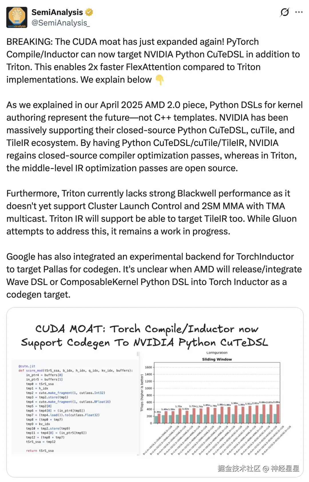 这直接推动了 cuTile 的出现——为了稳固商业护城河,NVIDIA 不得不进一步提升其软件体系的封装程度与使用体验,使更多开发者选择留在 CUDA 生态内。SemiAnalysis 发文称,cuTile 的问世是 NVIDIA 试图加深 CUDA 护城河的重要举措, 「PyTorch 编译器现在除了支持 Triton 之外,还可以支持 NVIDIA Python CuTeDSL,这使得 FlexAttention 的速度比 Triton 实现快 2 倍。NVIDIA 一直大力支持其闭源的 Python CuTeDSL、cuTile 和 TileIR 生态系统,通过 Python CuTeDSL/cuTile/TileIR,NVIDIA 重新获得了闭源编译器优化通道。」