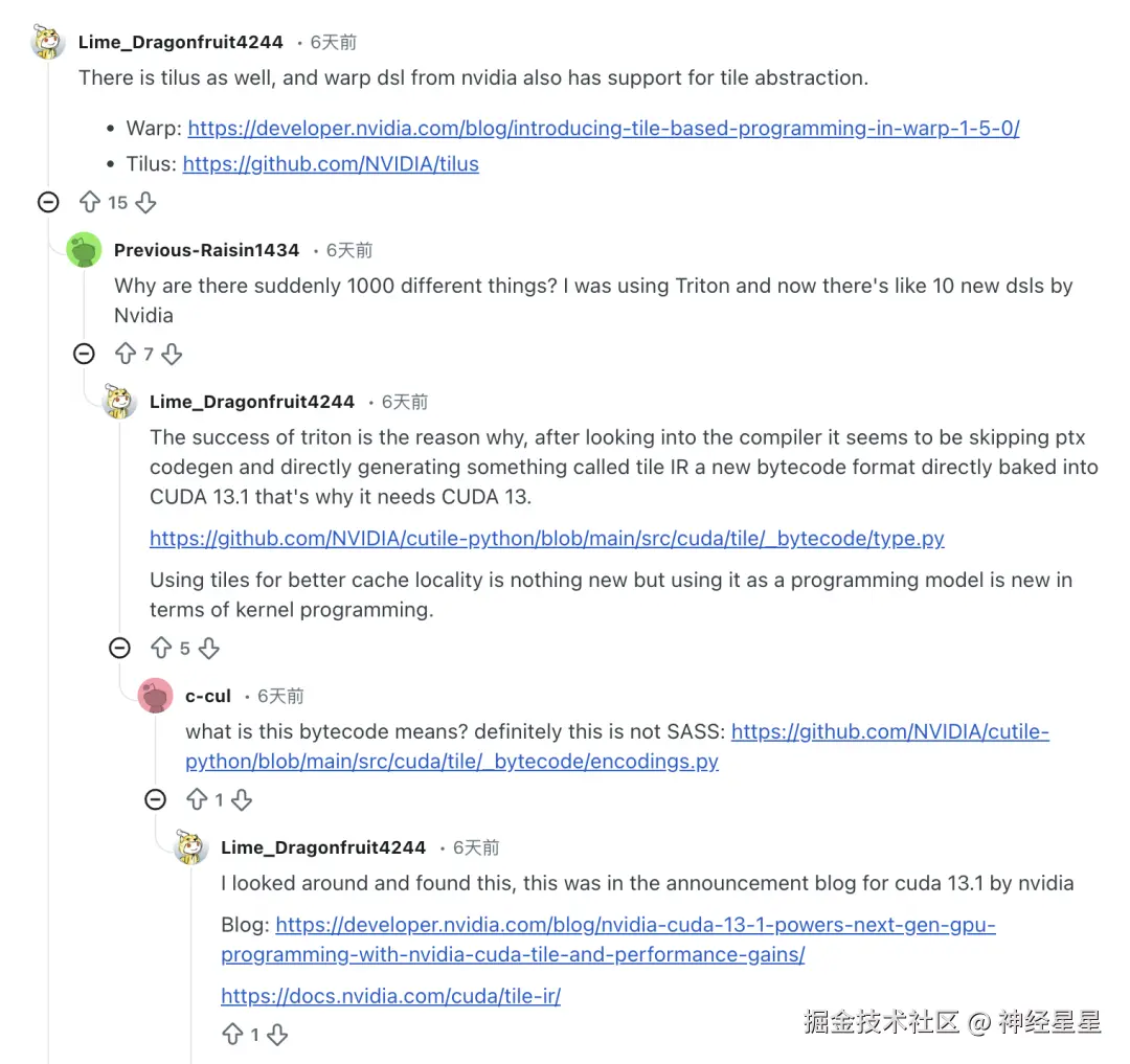 事实上,cuTile 的市场反响中夹杂着争议的声音。 有开发者使用后反馈称,Tile 优化是新颖的进步,但 DSL 过多也带来了新的学习成本。Reddit 用户 Previous-Raisin 1434 评论表示,cuTile 新增的 DSL 让他在过渡阶段感到冗杂。