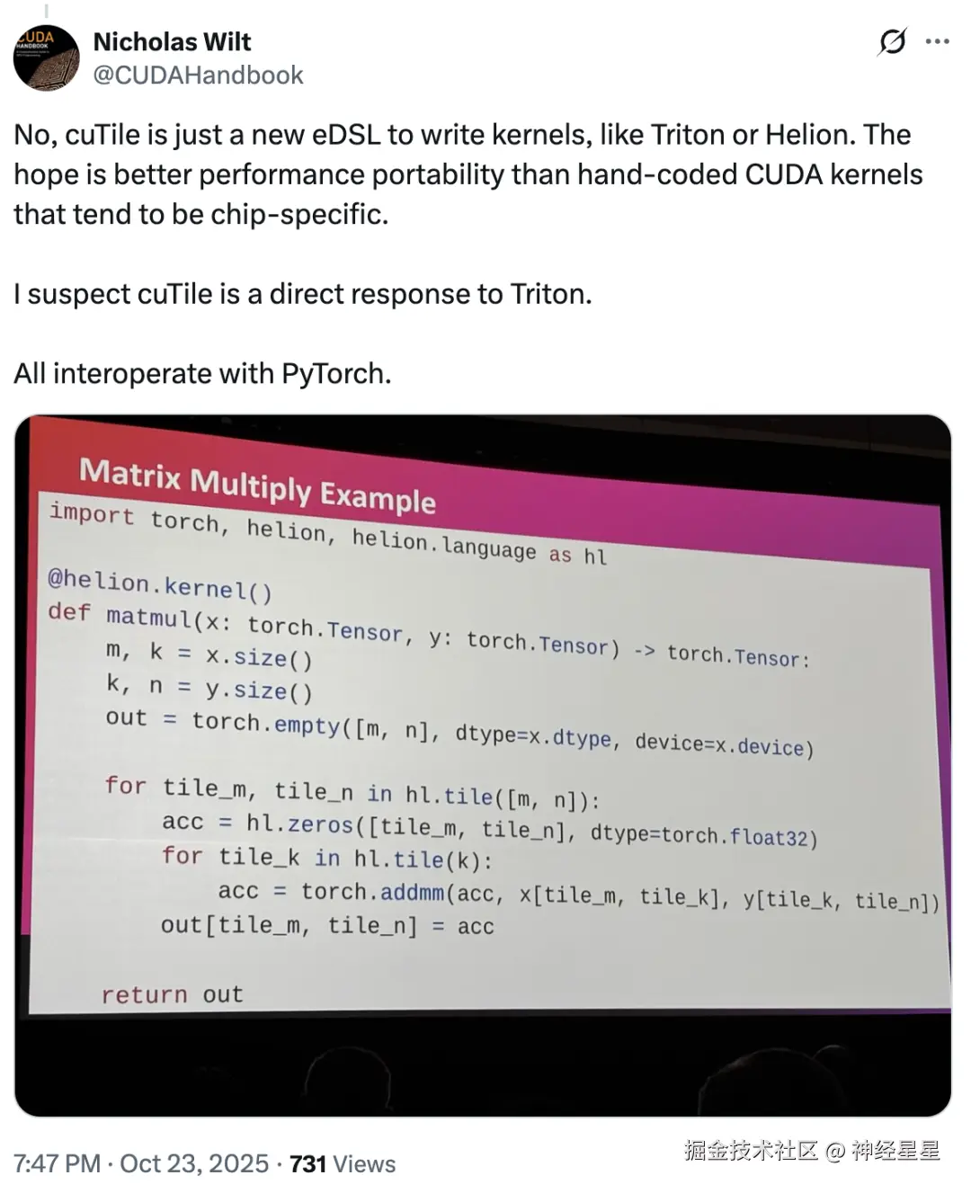 对此,CUDA 初始团队成员 Nicholas Wilt 甚至也发文称, 「很难不怀疑 cuTile 就是直接针对 Triton 而开发的。cuTile 就是一个新的 eDSL,用于编写内核,就像 Triton 或 Helion 一样。」