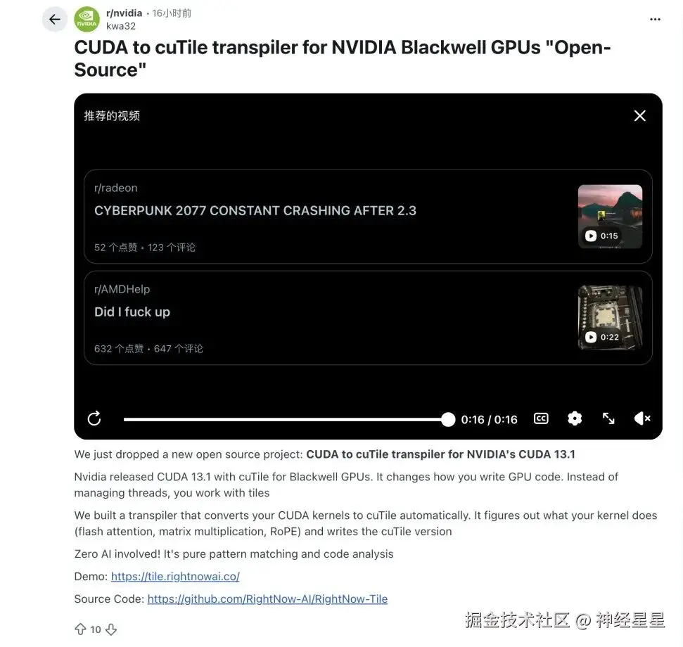 尽管 cuTile 仍处在早期阶段,但业内已经出现了主动探索迁移路径的实践。一些算法从业人员开始尝试构建从 CUDA C++ 到 cuTile 的自动化转换工具, 希望在现有工程代码和新范式之间建立可行的桥梁。其中,有 Reddit 社区的开发者发起了开源项目,能够将部分 CUDA Kernel 翻译为基于 Tile 的形式,以满足社群潜在迁移需求。