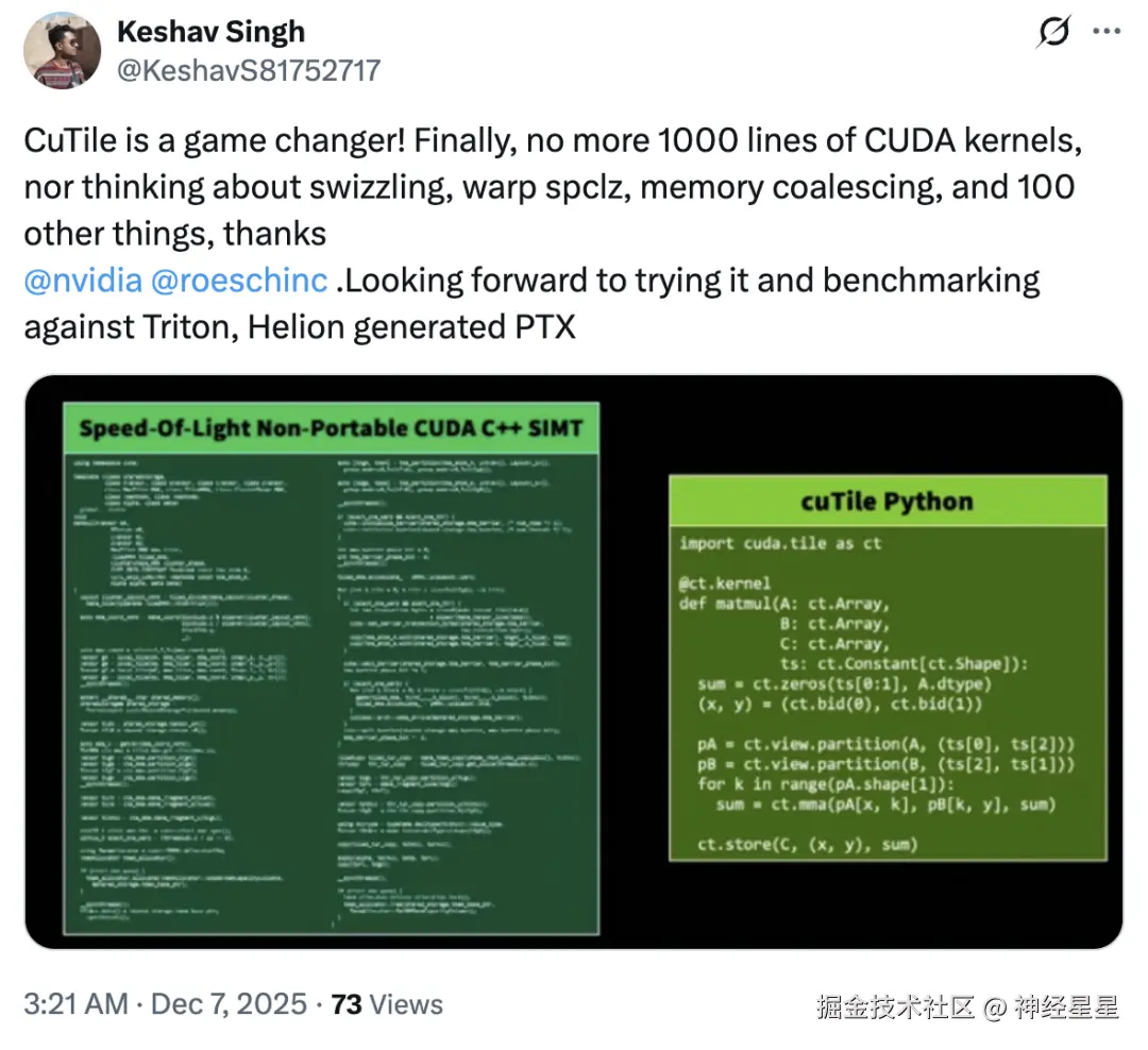 而在进入公共视野后,cuTile 也迅速在开发者社区引发了有关自定义算子开发周期、与竞品 Triton 的直接竞争,以及能否成为 Python 默认入口的广泛讨论。虽然 cuTile 还处在非常早期的阶段,但从目前的开发者反馈来看,它已经具备成为新范式的潜力。