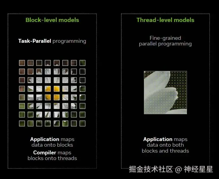 Tile 模型(左图)将数据划分为块,由编译器映射到线程;SIMT 模型(右图)则将数据同时映射到块和线程