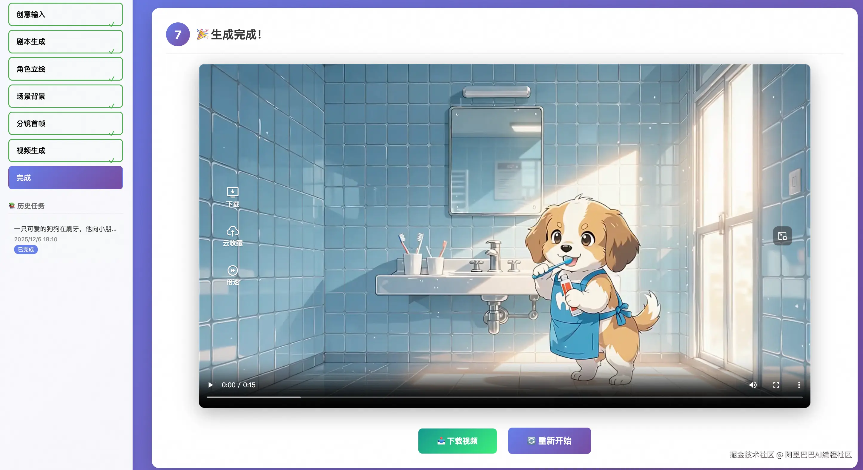 - 视频生成: 确认好分镜图后,使用Wan2.5-i2v-preview结合剧本描述和台词同步生成视频和相应的配音,音画同步,并且自动完成剪辑拼接,整个过程3
